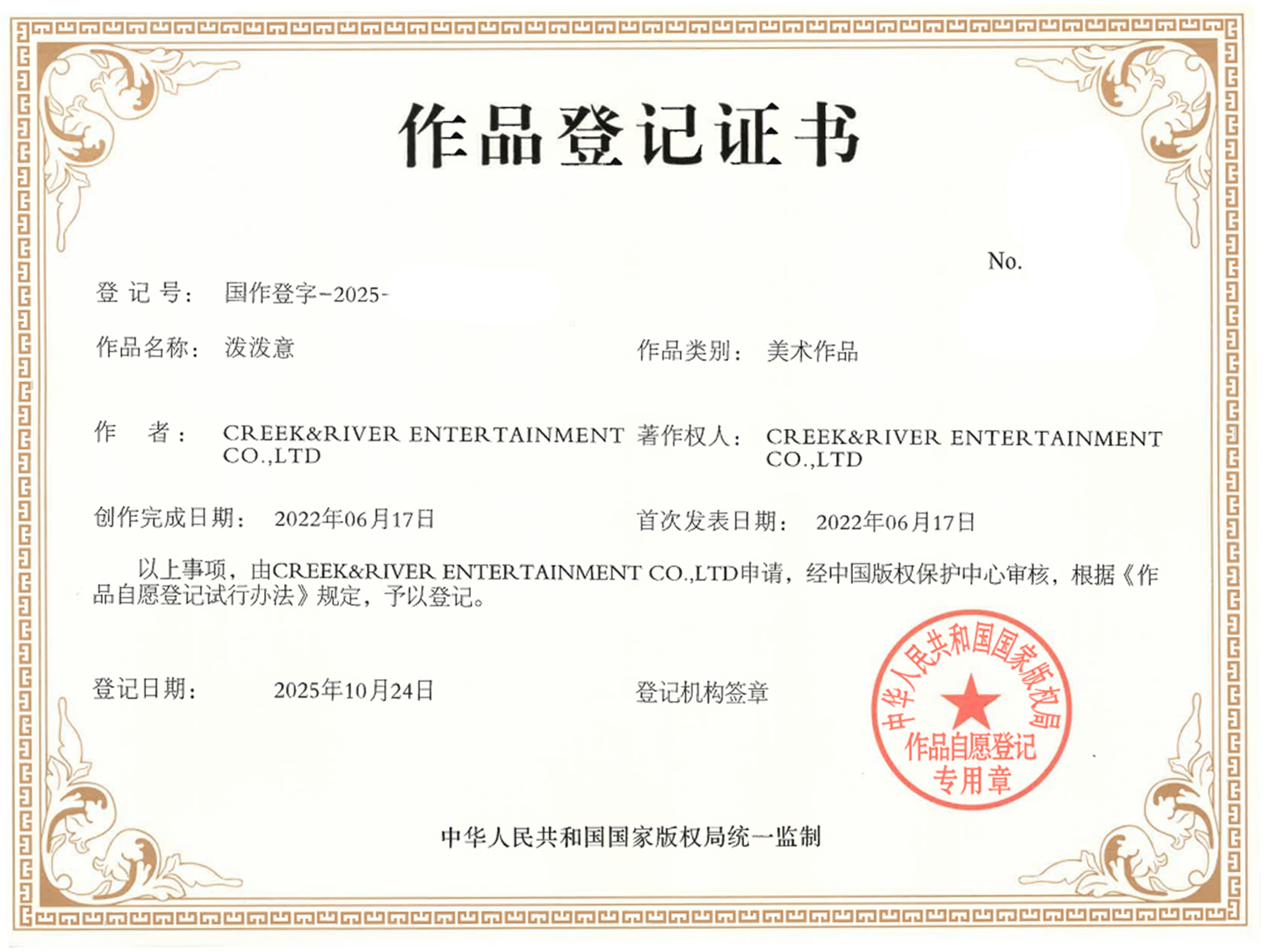 중국 국가저작권국 산하 중국저작권보호센터를 통해 저작권 등록을 공식 완료했습니다.